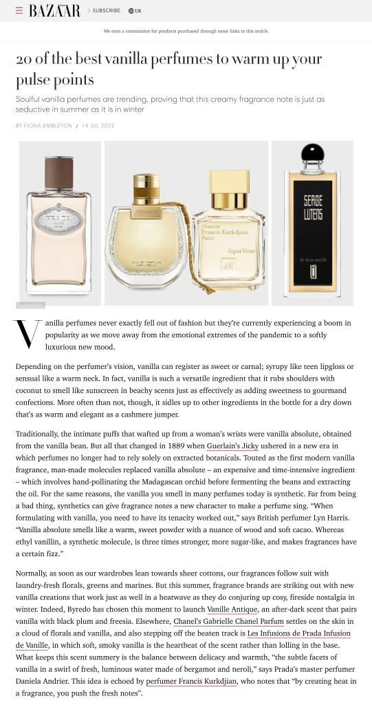 Harper’s Bazaar https://www.harpersbazaar.com/uk/beauty/fragrance/g40610137/vanilla-perfume/ https://www.harpersbazaararabia.com/gallery/does-blue-light-cause-wrinkles-why-protecting-your-skin-from-screen-time-is-important https://www.harpersbazaararabia.com/hbanews/how-a-scent-filled-trip-down-memory-lane-can-alleviate-anxiety-and-loneliness https://www.harpersbazaararabia.com/beauty/skin-care/everything-you-need-to-know-about-zoom-face-and-how-to-beat-it https://www.harpersbazaararabia.com/beauty/microbiome-skincare-1 Share this: Share on X (Opens in new window) X Share on Facebook (Opens in new window) Facebook Like Loading...